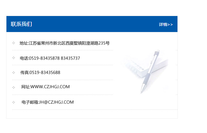 傳真:0519-83435688    郵編:213135    網址:WWW.czjhgj_com.tqsrq.com    電子郵箱:JH@czjhgj_com.tqsrq.com